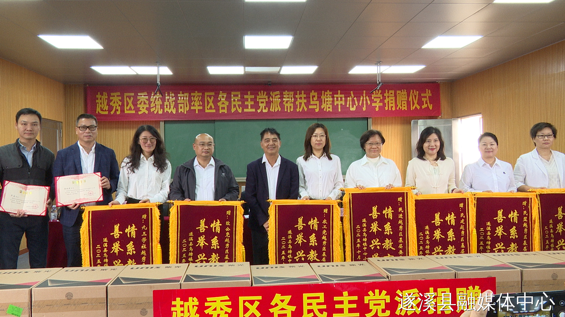 捐赠仪式上,广州市越秀区委统战部联合区各民主党派向该校捐赠了电脑、打印机等教学设备。乌塘中心小学向越秀区委统战部及各民主党派代表回赠了牌匾和锦旗。