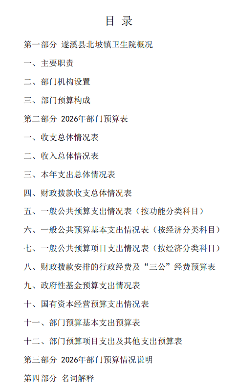 2026年遂溪县北坡镇卫生院部门预算 | | 作者: | 来源:遂溪县卫生健康局 | 时间:2026-03-31 10:14:22 点击数:- 2026年遂溪县北坡镇卫生院部门预算.pdf 【打印正文】