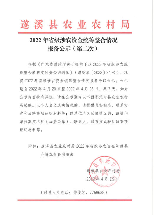 2022年省级涉农资金统筹整合情况报备公示(第二次) | | 作者: | 来源:本网 | 时间:2022-04-19 11:06:00 点击数:- 附件:遂溪县农业农村局2022年省级涉农资金统筹整合情况报备明细表.pdf 【打印正文】