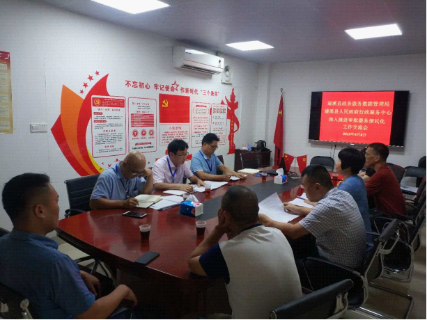 2019年4月8日下午,县政数局、县政府行政服务中心深入推进审批服务便民化工作交流会在中心二楼联审会议室召开。县政数局、县政府行政服务中心领导班子全体参加会议。