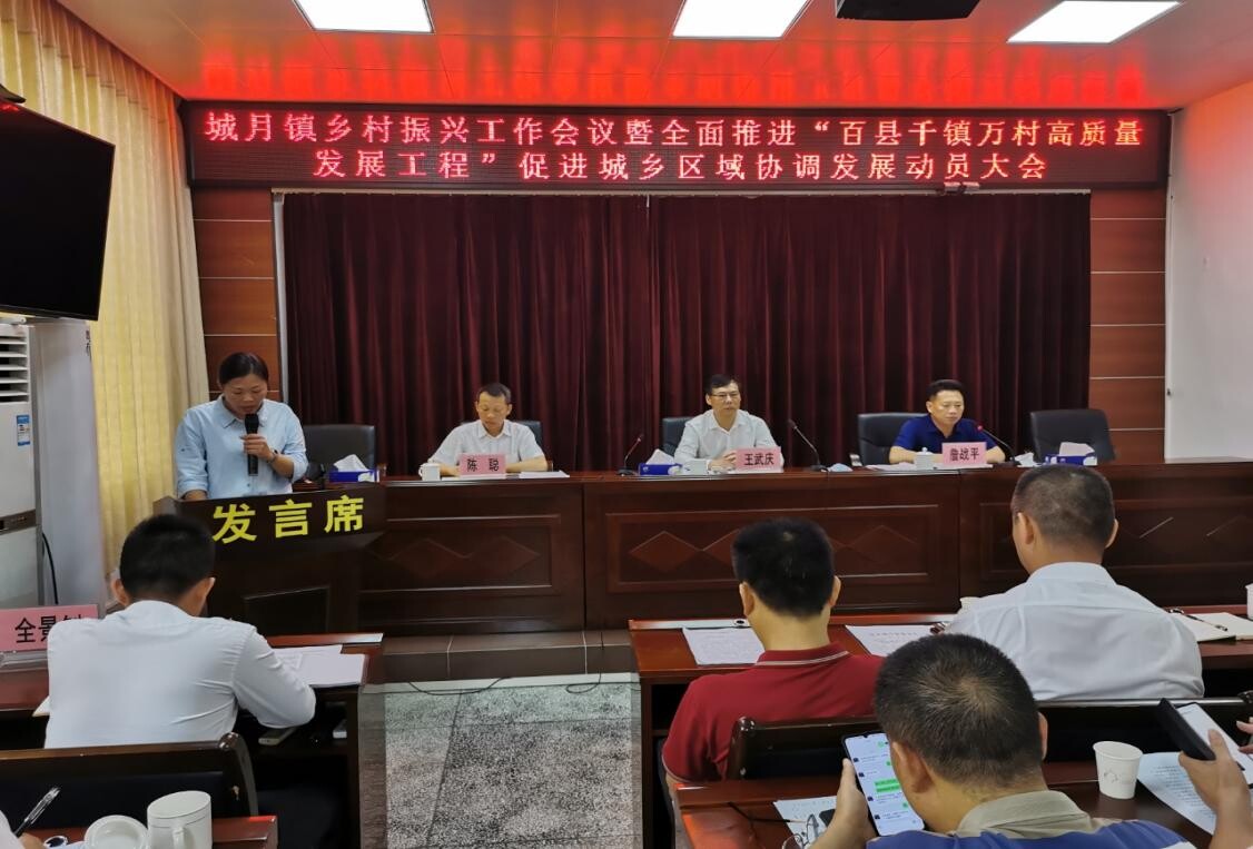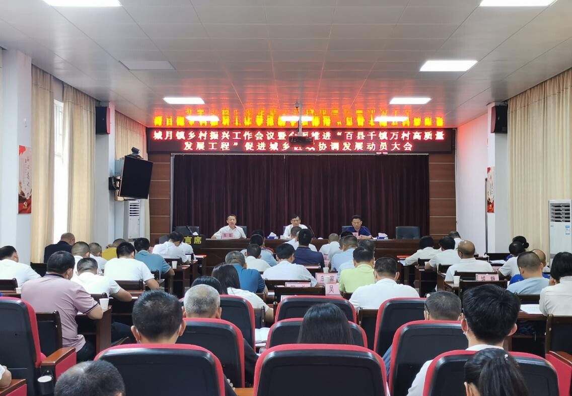为进一步做好乡村振兴迎检工作,积极响应县级深入实施“百县千镇万村高质量发展工程”的部署要求,开创城乡区域协调发展新局面,2023年5月11日,城月镇召开乡村振兴工作会议暨全面推进“百县千镇万村高质量发展工程”促进城乡区域协调发展动员大会。会议由镇委副书记詹战平主持,镇领导班子成员(含主任科员)、各村(社区)支部书记、驻镇帮镇扶村工作队全体成员、各下乡工作组组长参加会议。