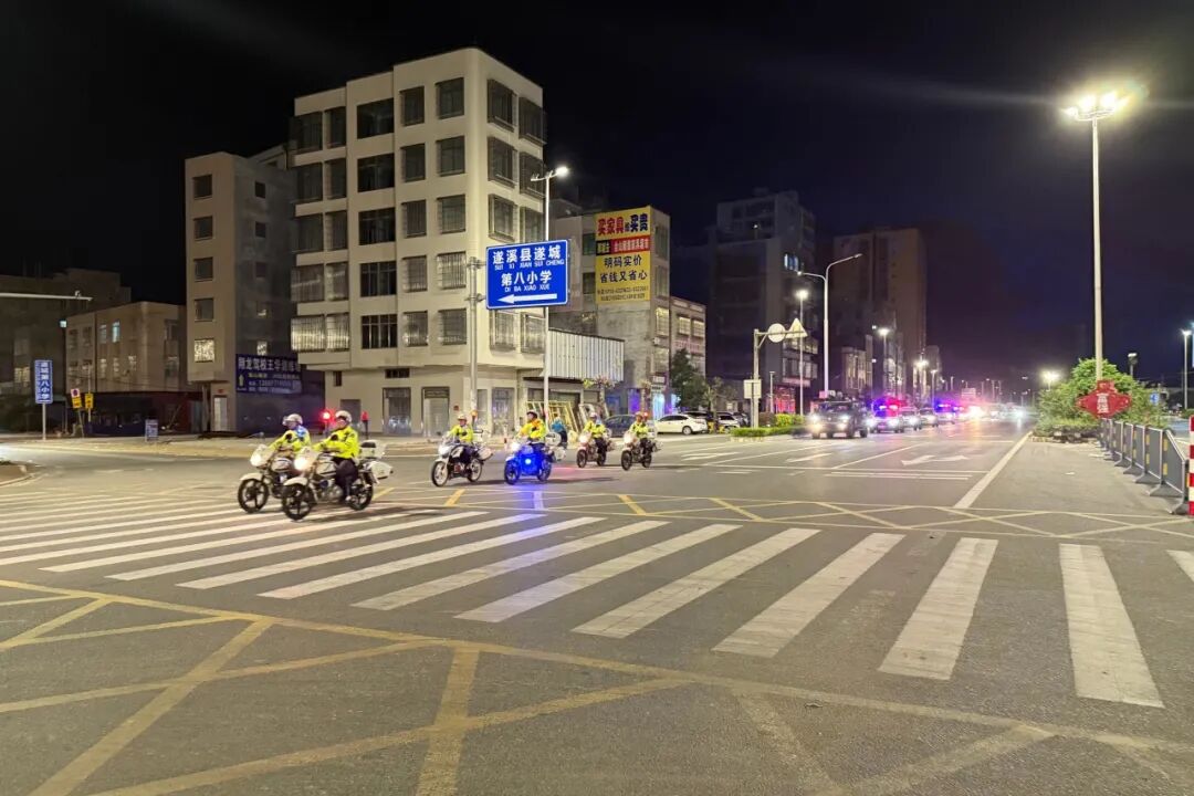遂溪县副县长、县公安局局长林林同志在动员讲话中强调,全县公安机关要聚集全国第十五届运动会安保维稳主线,坚决贯彻执行省厅、市局党委和县委县政府的部署要求,全警迅速进入临战状态,以打开路、以打促防、以防促稳,持续严打高压态势,全力推进巡查宣防行动,在实战中接受党和人民的检验。警灯闪烁、气势如虹,近40辆警务用车拉着警报呼啸有序穿过县城主干道、繁华商圈、网红街道,向广大人民群众展示遂溪公安良好精神风貌和必胜信心决心。
