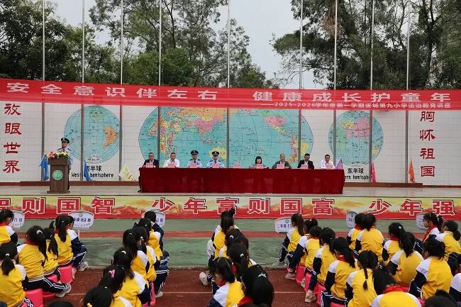 11月3日上午,遂城第九小学运动场旌旗飘扬,全校师生齐聚于此,借助周一升国旗契机开展法治安全教育专题活动。活动由遂溪县教育局党组成员、副局长李风华主持,遂溪县人民政府副县长、县公安局党委书记、局长林林同志以“安全意识伴左右 健康成长护童年”为题,为全校师生带来了一堂生动深刻的法治安全教育课。