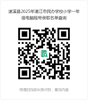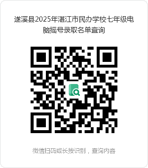 根据湛江市教育局湛江市招生委员会《关于做好2025年民办义务教育招生入学工作的通知》的安排,2025年湛江市民办义务教育学校小学一年级、初中七年级(遂溪生源)招生电脑摇号工作已于7月25日下午在人大代表、政协委员、公安局、司法局、纪检监察代表、中小学校和家长代表等的全程监督下顺利完成,现将电脑摇号录取名单予以公布,请家长们扫描下方二维码查询录取结果。