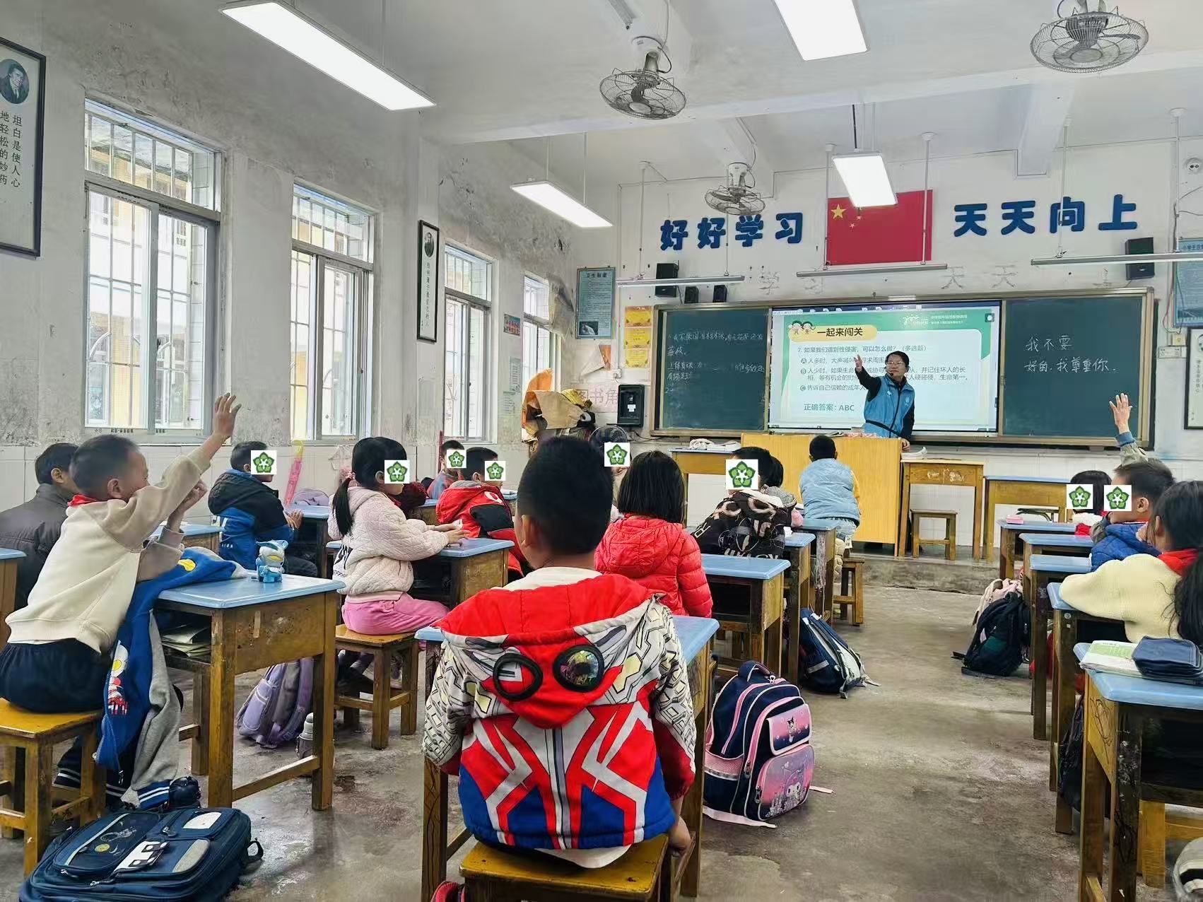 随后,社工组织同学们观看了《我的身体权力》和《小云遇到了坏人》两部科普动画视频,用科学而易于理解的语言,向同学们介绍了身体的隐私部位,并重点讲解了如何识别与防范性侵害行为,以及在遇到不舒服的触碰或性侵害行为时,应如何正确应对和求助。并通过设置知识问答题,检验同学们对当堂内容的掌握程度。现场气氛活跃,同学们争相举手,踊跃参与。