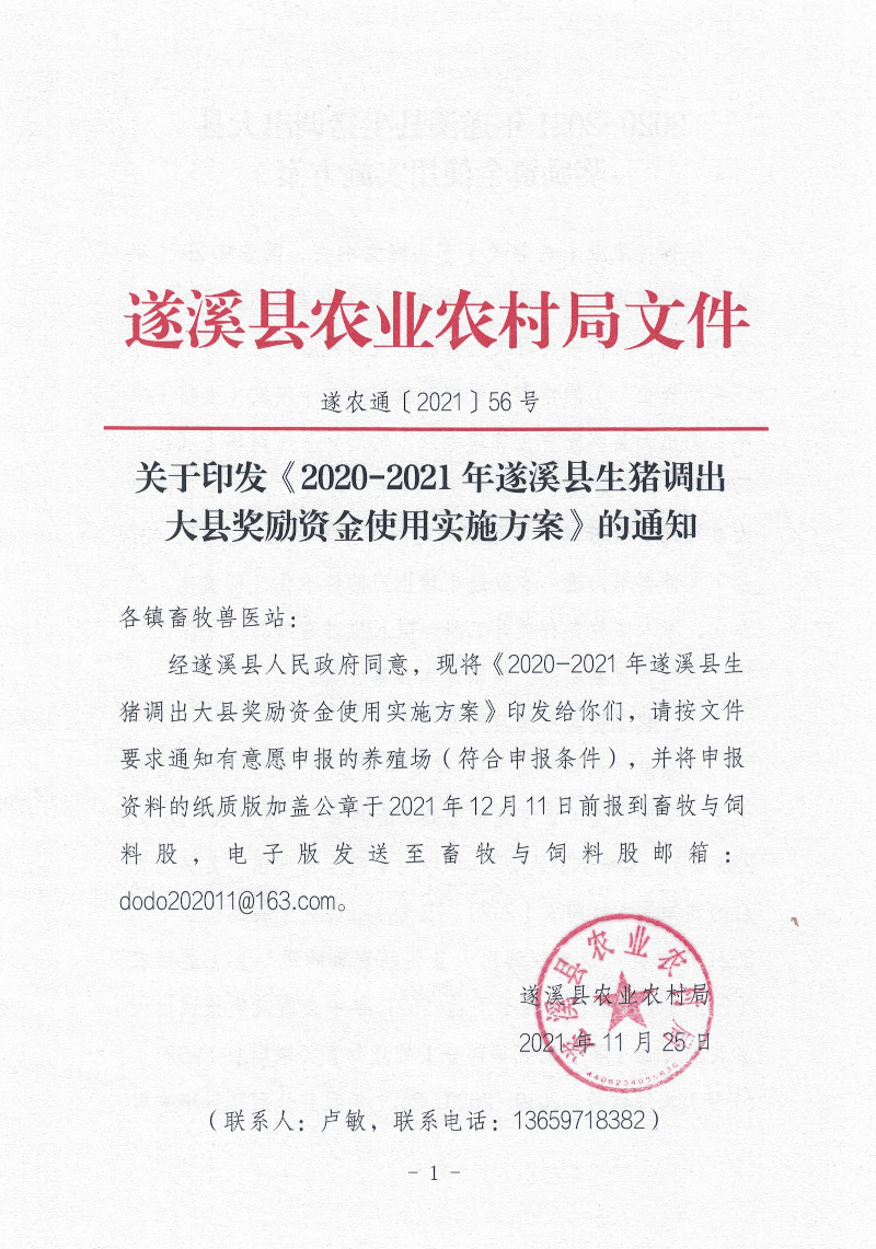 关于印发《2020-2021年遂溪县生猪调出大县奖励资金使用实施方案 》的通知(遂农通〔2021〕56号).doc