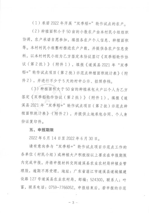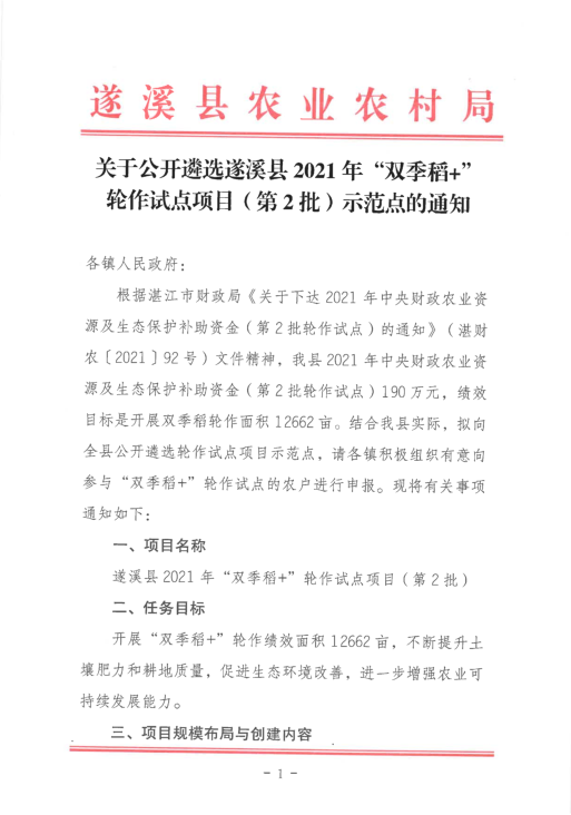 关于公开遴选遂溪县2021年“双季稻+”轮作试点项目(第2批)示范点的通知