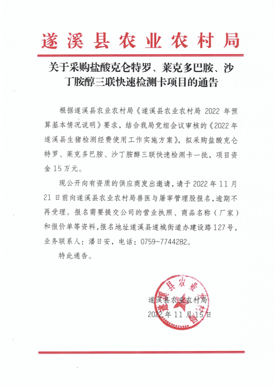 关于采购盐酸克仑特罗、莱克多巴胺、沙丁胺醇三联快速检测卡项目的通告