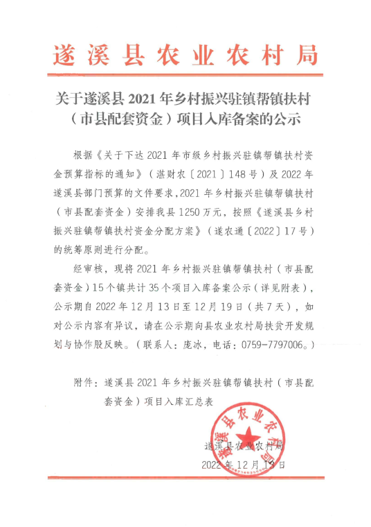 关于遂溪县2021年乡村振兴驻镇帮镇扶村(市县配套资金)项目入库备案的公示