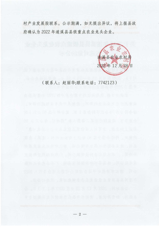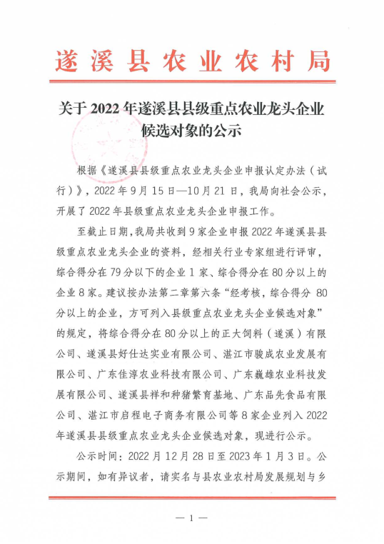 关于2022年遂溪县县级重点农业龙头企业候选对象的公示