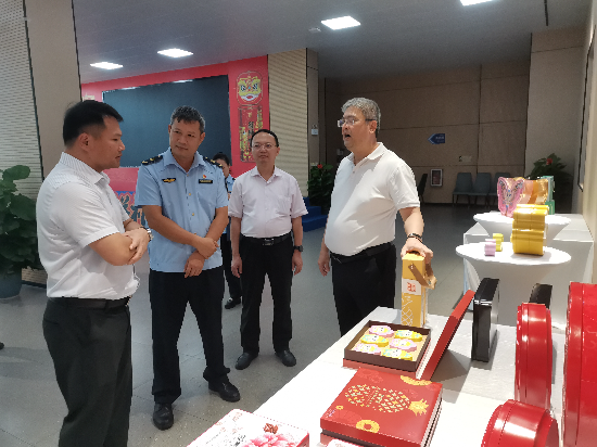 在检查生产加工环节后,林挺局长听取上述两家月饼生产企业负责人对中秋应节月饼生产情况的汇报,强调无论当前的经济环境如何变化,作为食品生产企业,必须始终把食品安全放在第一位,始终把人民的生命健康放在第一位,严控食品生产过程,把好月饼生产的质量关;同时也对广东御唐府蓝罐莲蓉饼业有限公司将自己的企业文化、中秋应节月饼的包装与遂溪当地的醒狮文化精神较好融合的做法给予了充分的肯定。