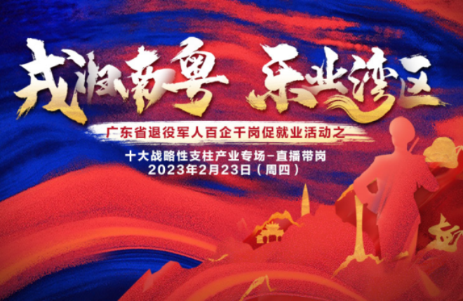 为深入贯彻党的二十大精神,全面贯彻习近平总书记关于退役军人工作重要论述,认真落实党中央、国务院和广东省委、省政府有关决策部署,全力促进自主就业退役军人和随军家属高质量充分就业,广东省退役军人事务厅举办的“戎归南粤·乐业湾区”——广东省退役军人百企千岗促就业活动之十大战略性支柱产业专场直播带岗活动,将于2023年2月23日14:30隆重上线。