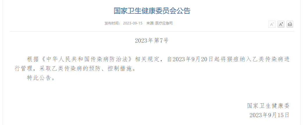 国家卫生健康委:猴痘9月20日起纳入乙类传染病管理