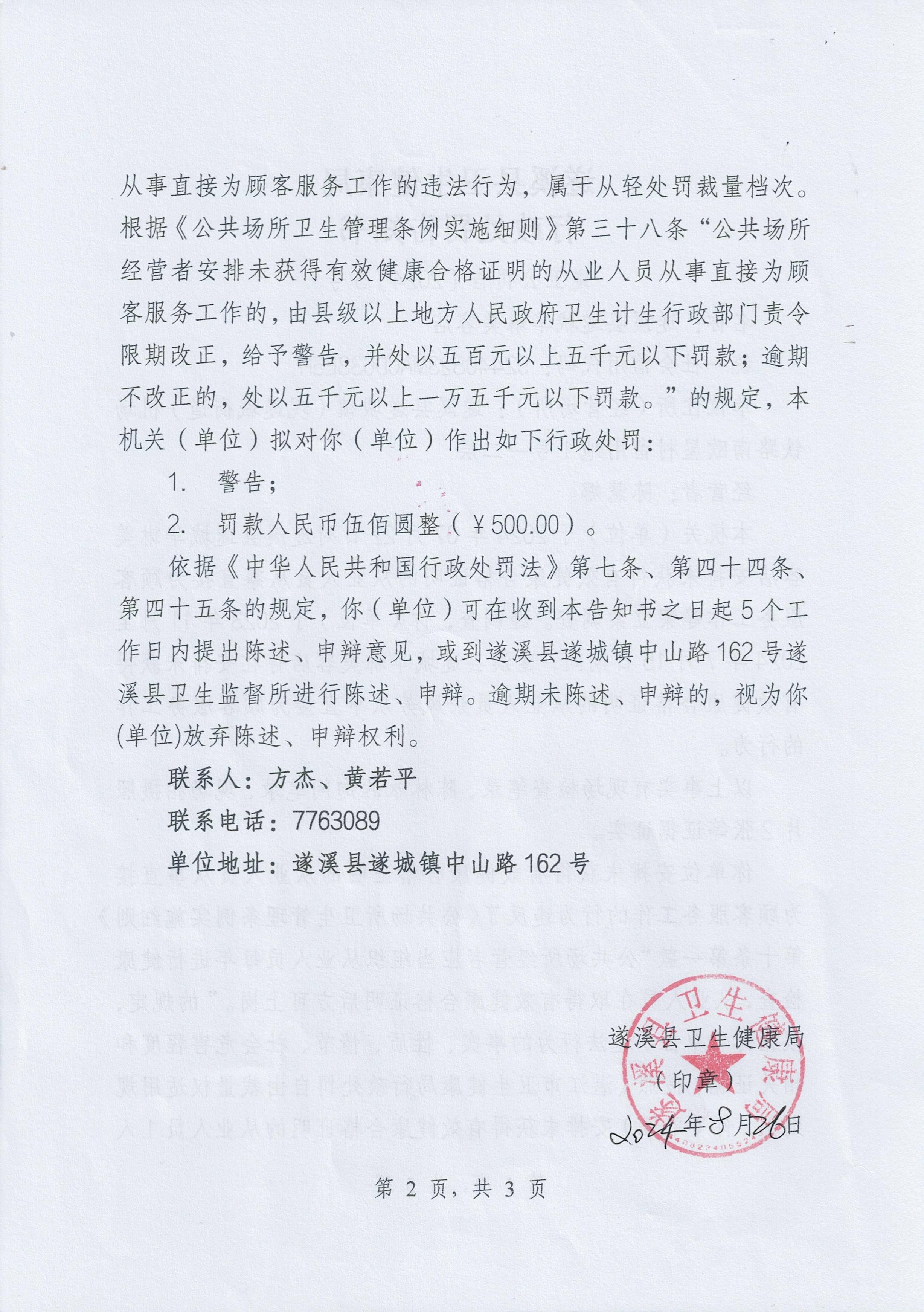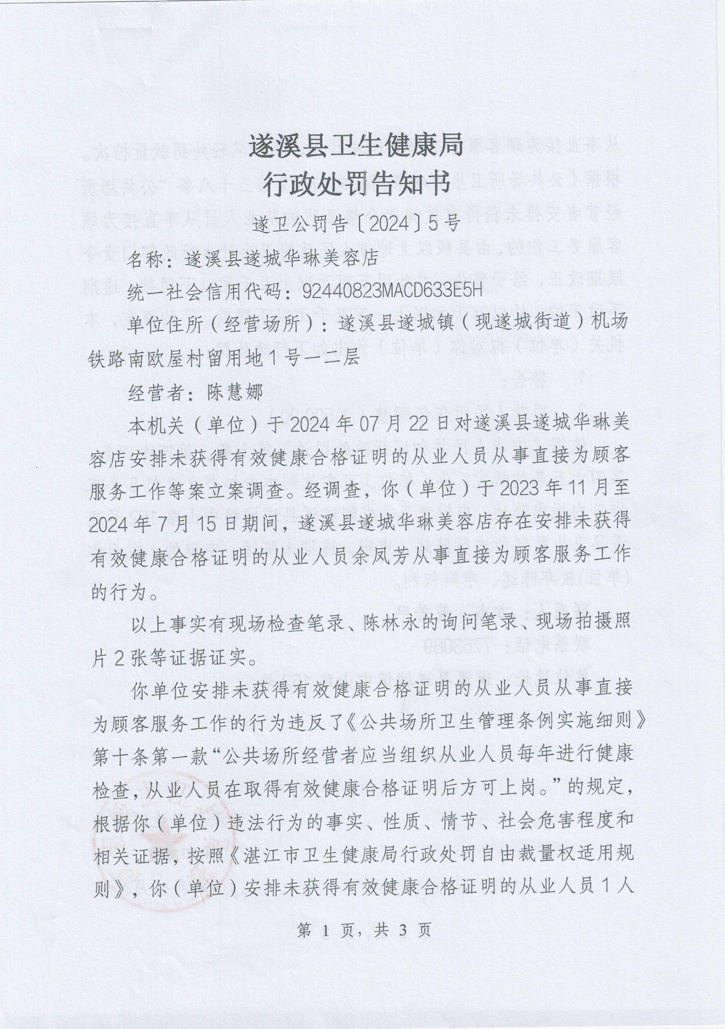 遂溪县遂城华琳美容店违反了《公共场所卫生管理条例实施细则》第十条第一款“公共场所经营者应当组织从业人员每年进行健康检查,从业人员在取得有效健康合格证明后方可上岗。”之规定的违法行为。本局于2024年08月26日作出了《行政处罚告知书》(见附件)。