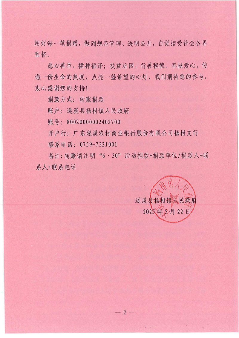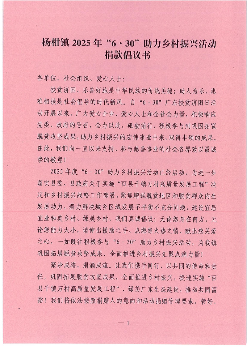 杨柑镇2025年“6·30”助力乡村振兴活动捐款倡议书