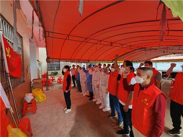 (芝兰小学核酸检测点临时党支部在现场面对党旗举行“重温入党誓词”仪式)