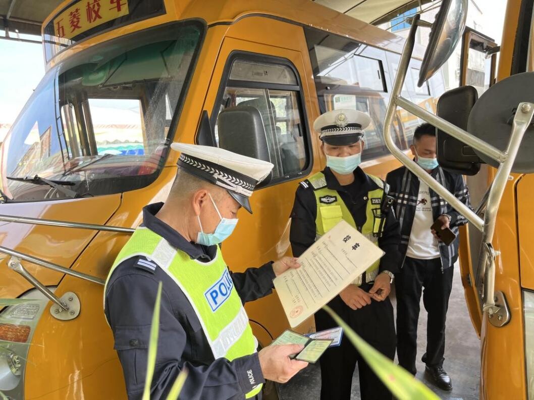 图为交警中队检查校车驾驶人相关证件