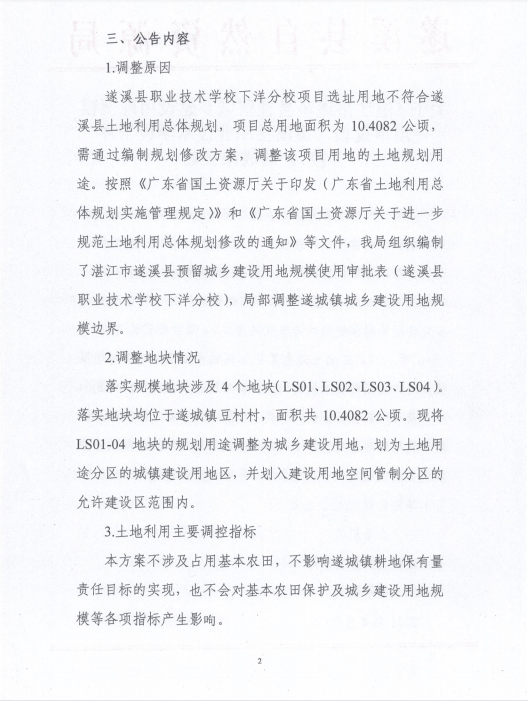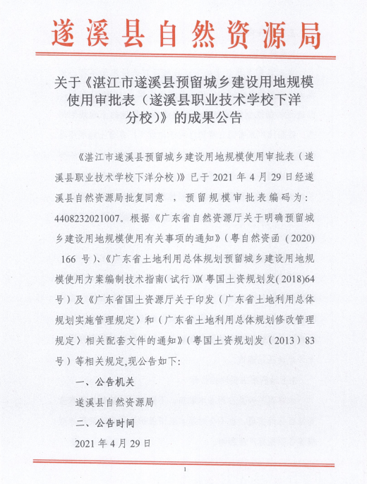 关于《湛江市遂溪县预留城乡建设用地规模使用审批表(遂溪县职业技术学校下洋分校)》的成果公告