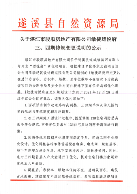 关于湛江市骏顺房地产有限公司敏捷珺悦府三、四期修规变更说明的公示