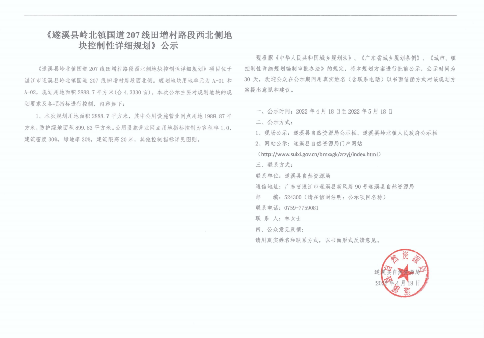 关于《遂溪县岭北镇国道207线田增村路段西北侧地块控制性详细规划》公示