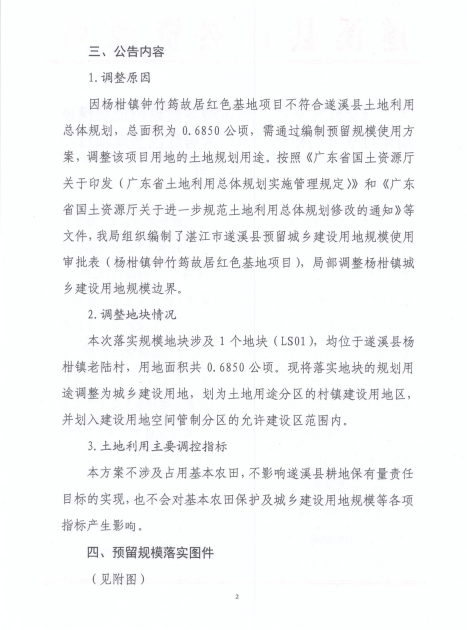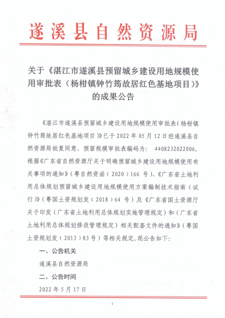 关于《湛江市遂溪县预留城乡建设用地规模使用审批表(杨柑镇钟竹筠故居红色基地项目)》的成果公告
