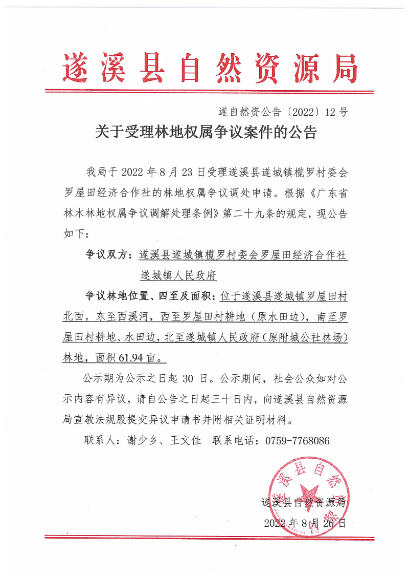 关于受理林地权属争议案件的公告 遂自然资公告﹝2022﹞12号