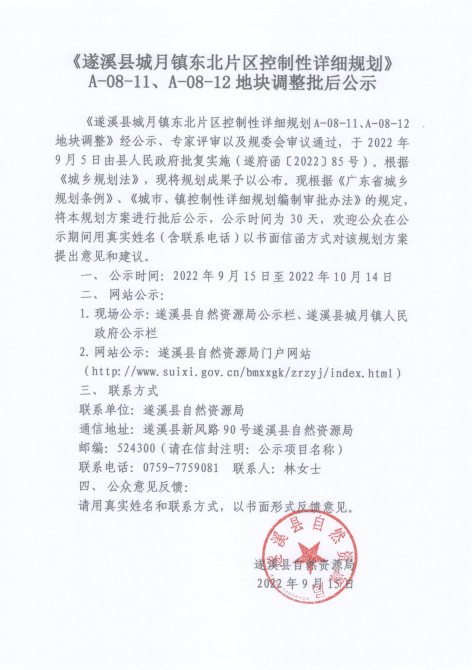 关于《遂溪县城月镇东北片区控制性详细规划》A-08-11、A-08-12地块调整批后公示