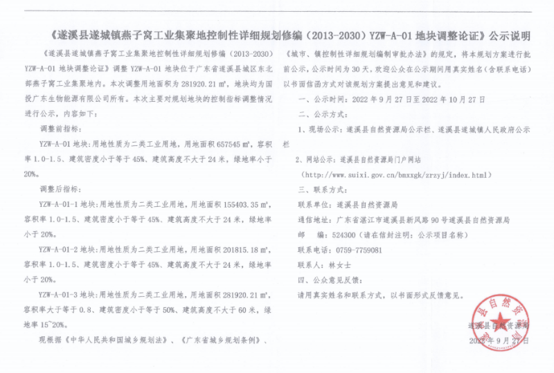 关于《遂溪县遂城镇燕子窝工业园集聚地控制性详细规划修编(2013-2030)YZW-A-01地块调整论证》公示说明