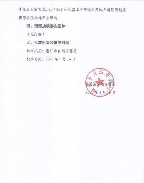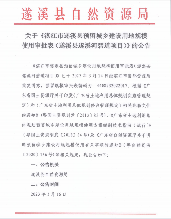 | 名称: | 关于《湛江市遂溪县预留城乡建设用地规模使用审批表(遂溪县遂溪河碧道项目)》的公告 | ||