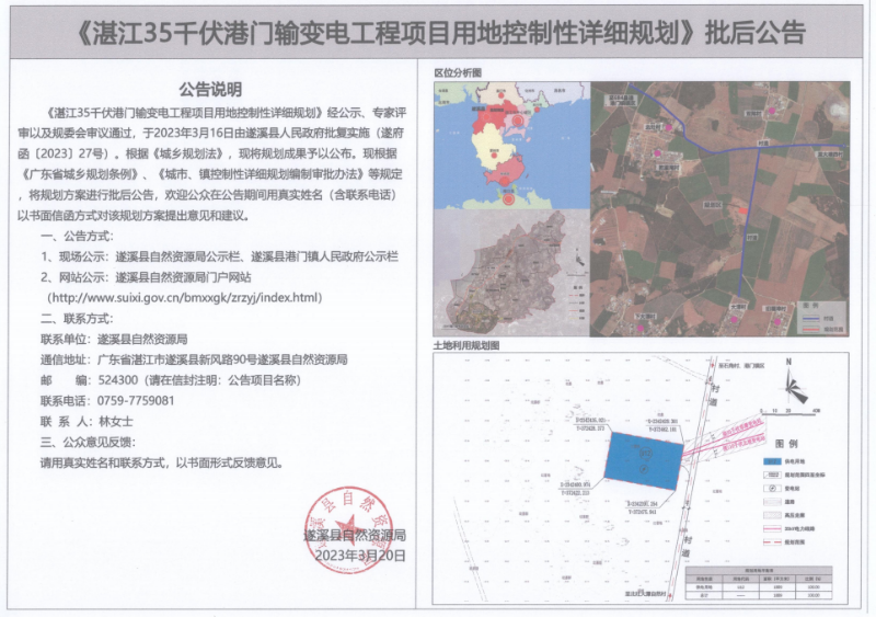 关于《湛江35千伏港门输变电工程项目用地控制性详细规划》批后公告
