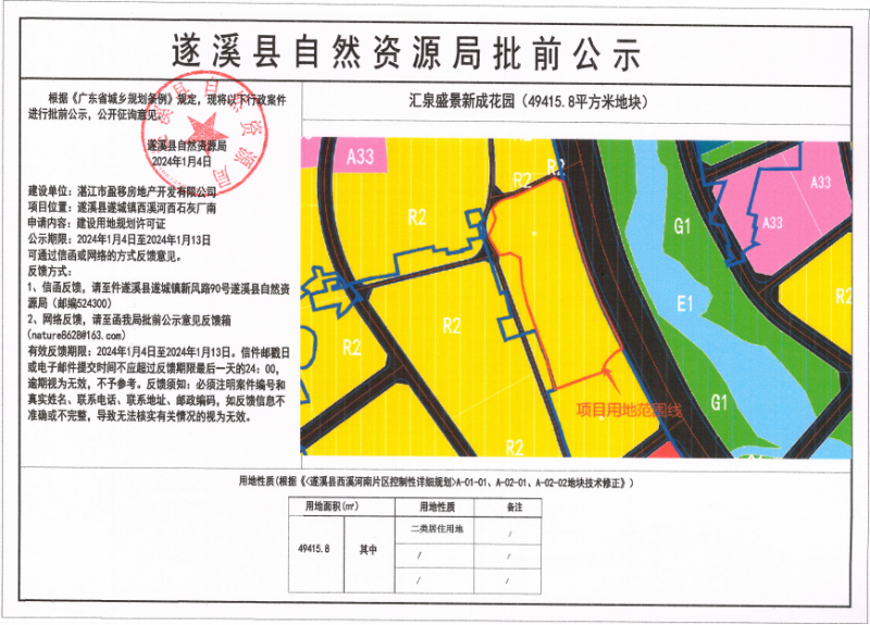 汇泉盛景新成花园(49415.8平方米地块)建设用地规划许可证批前公示