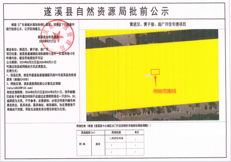 黄进汉、黄子俊、庞广月住宅楼项目建设用地规划许可证批前公示