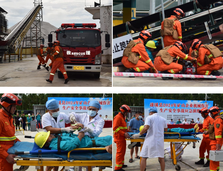 为增强非煤矿山安全防范意识和提高突发事件应急处置能力,全面提升抵御矿山机械伤害事故的能力,2024年6月26日下午,遂溪县安全生产委员会办公室在界炮镇广东万富矿业有限公司组织开展遂溪县2024年矿山企业机械伤害生产安全事故应急演练。