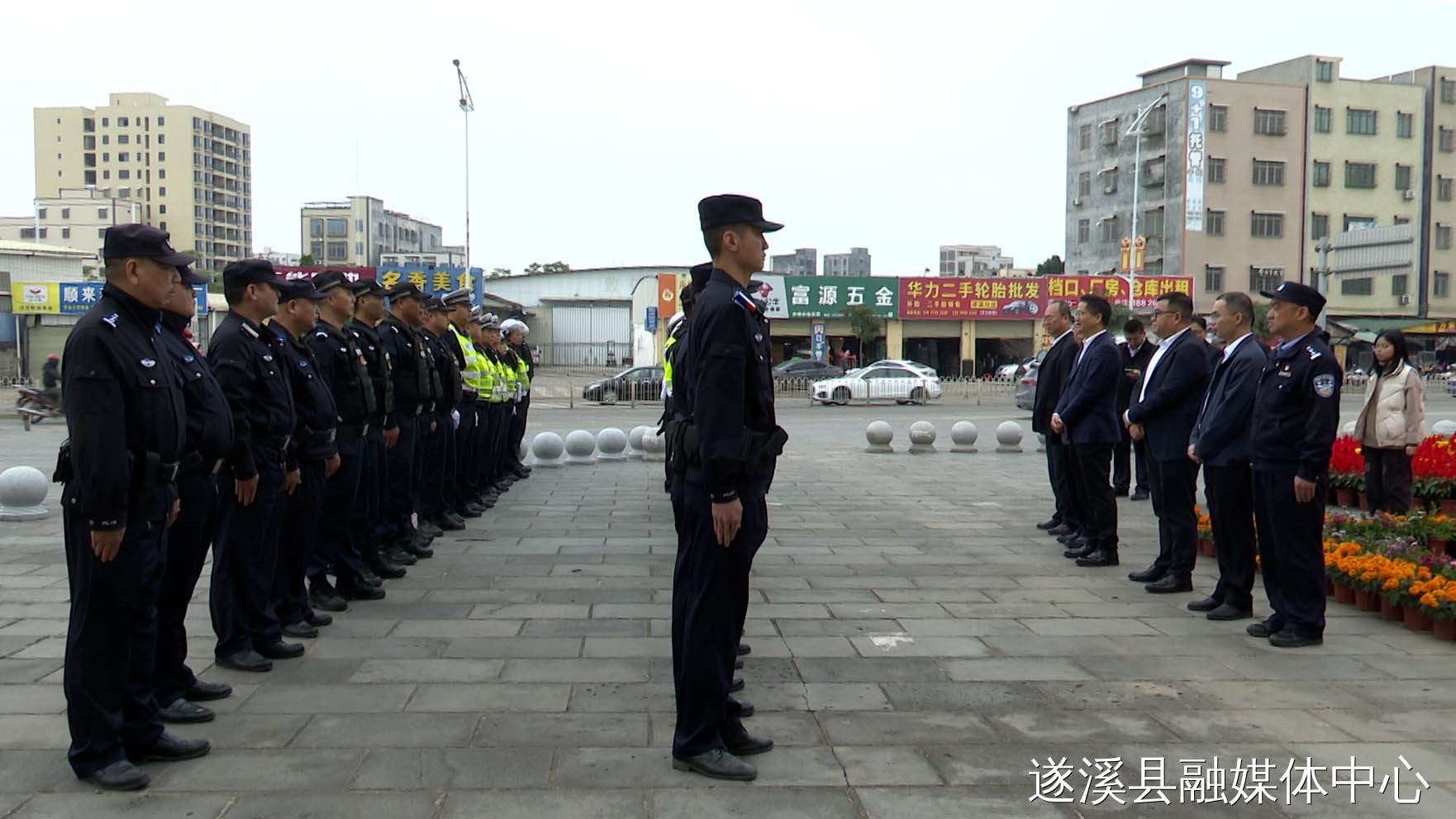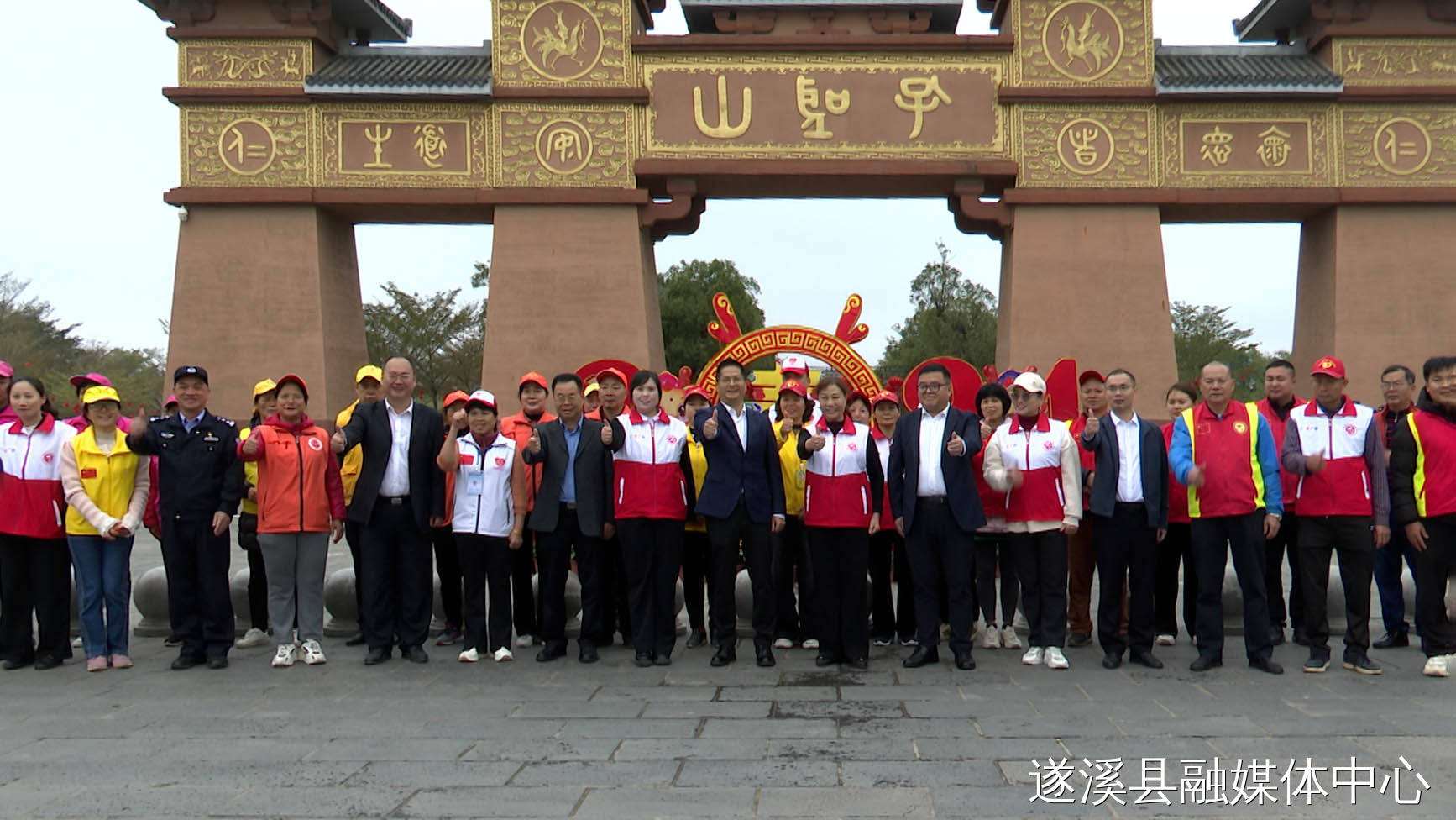 在孔子文化城正门,遂溪县领导向公安民警和志愿者致以节日祝福,对他们的辛勤付出表示感谢。希望公安民警要尽职履责,严格执法,扎实做好安保维稳和道路保畅工作,为人民群众度过一个欢乐祥和的春节贡献公安力量;志愿者要继续发扬志愿服务精神,用实际行动奉献爱心、汇聚爱心、传递爱心。