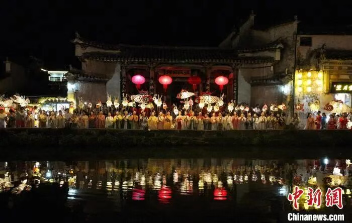 资料图:安徽省黄山市黟县宏村举行“花灯邀明月 欢乐度中秋”花灯游园会,人们舞动缤纷多彩的花灯漫步在古村中,邂逅良辰美景,在灯火月影中感受传统文化魅力,喜迎中秋佳节。(无人机照片)施亚磊 摄