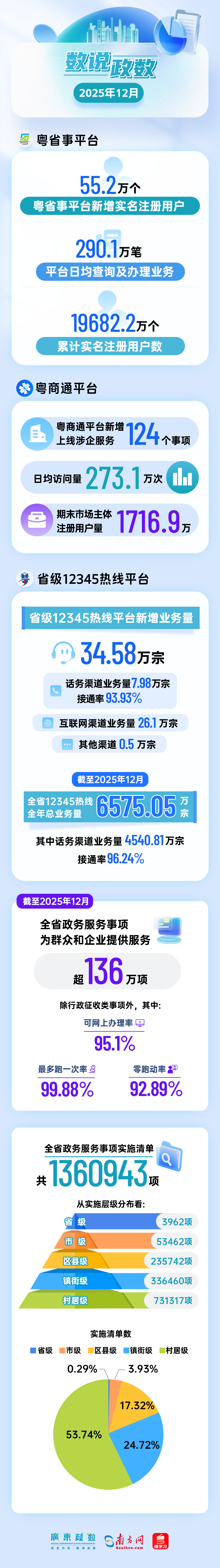 数据见实效!广东数字政府建设最新数据公布 | | 作者: | 来源:广东政数微信公众号 | 时间:2026-01-23 09:11:46 点击数:- 2025年12月,广东数字政府效能持续提升,为个人与企业带来便捷体验。一起来看广东数字政府建设最新数据→ 【打印正文】